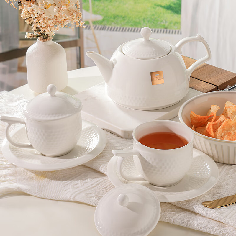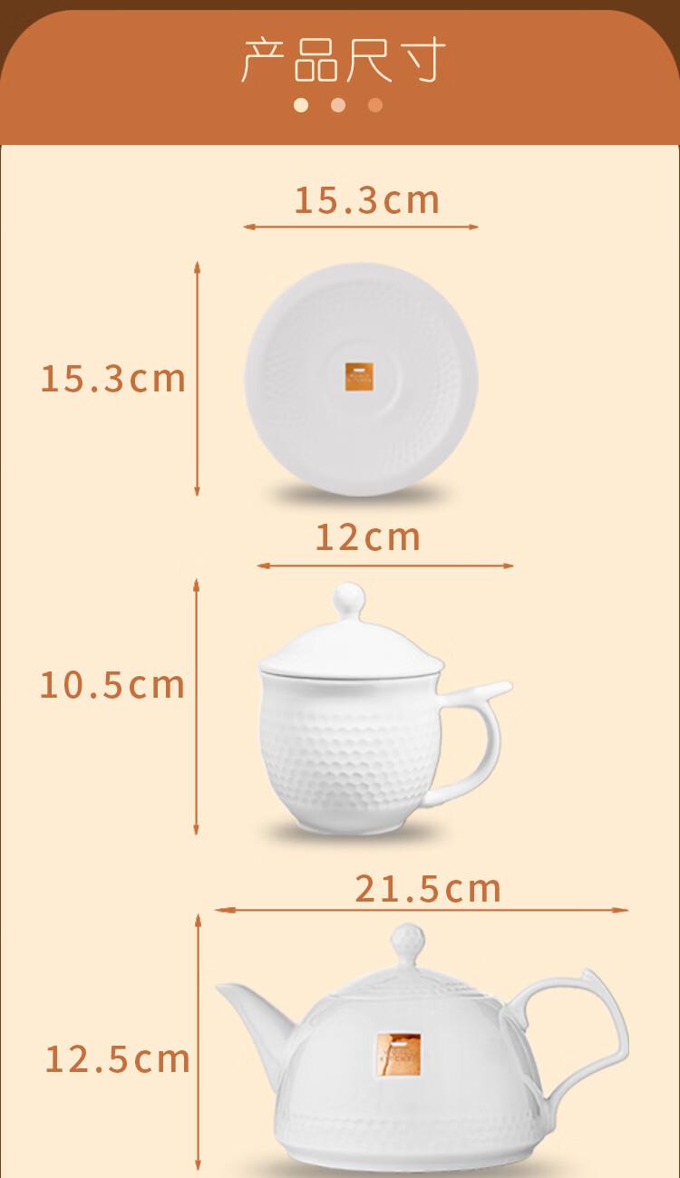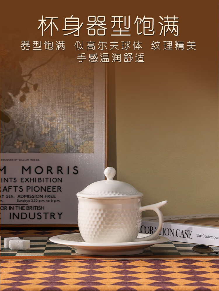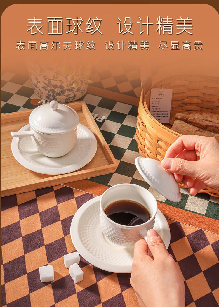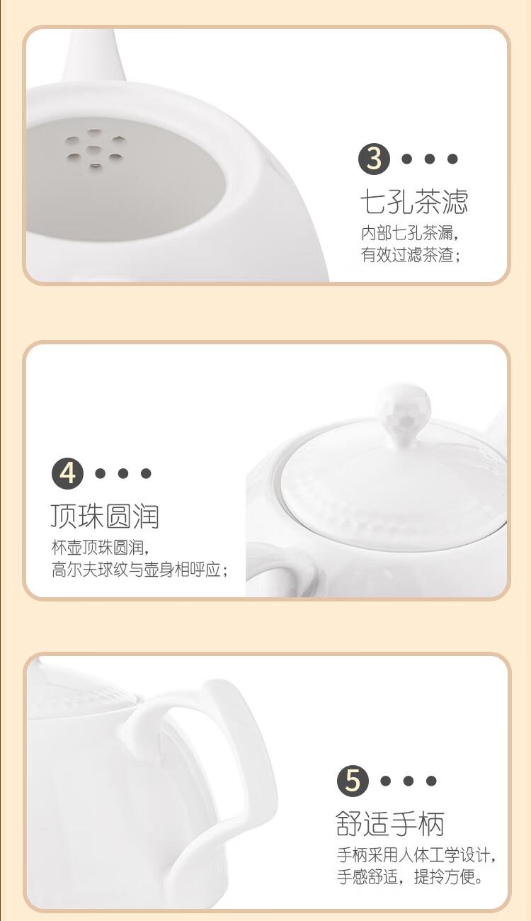 杯身器型饱满、球纹精美,似高尔夫球体,杯口圆润,手感温润舒适; 杯手柄采用人体工学设计,手感舒适,提拎方便; 杯盖顶珠圆润,高尔夫球纹与壶身相呼应; 杯底部厚实平整,防滑耐磨隔烫