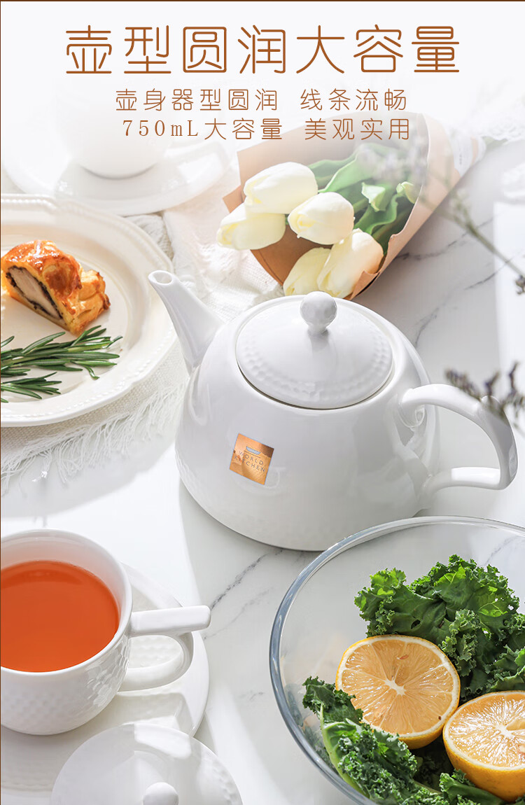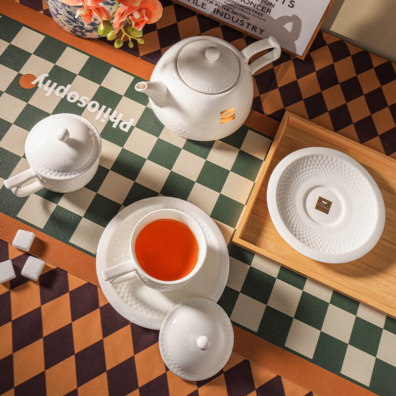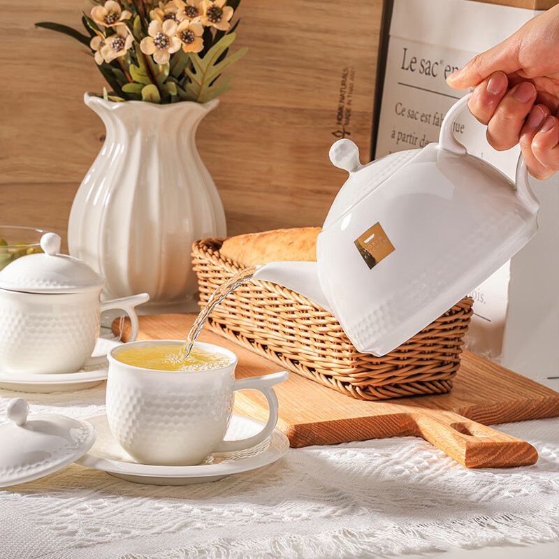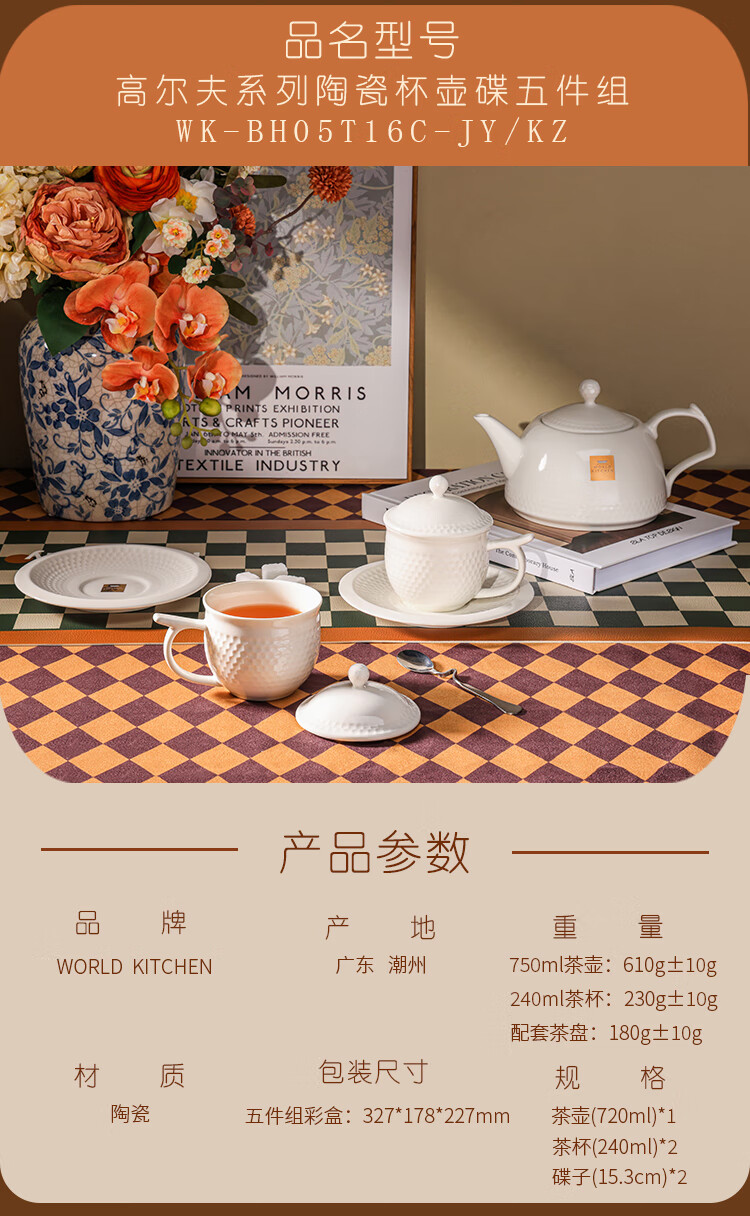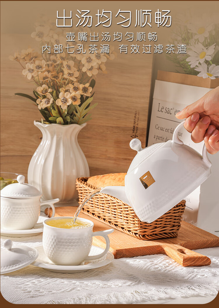 杯身器型饱满、球纹精美,似高尔夫球体,杯口圆润,手感温润舒适; 杯手柄采用人体工学设计,手感舒适,提拎方便; 杯盖顶珠圆润,高尔夫球纹与壶身相呼应; 杯底部厚实平整,防滑耐磨隔烫