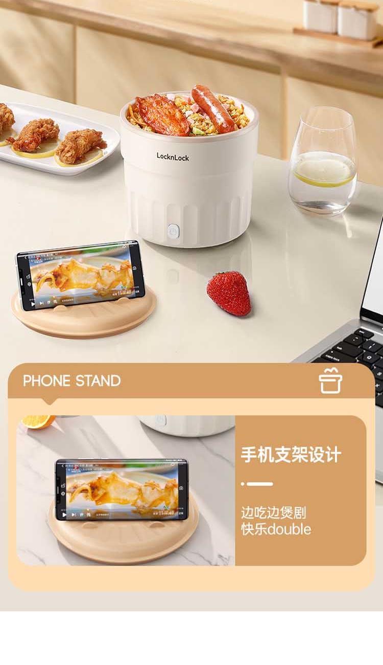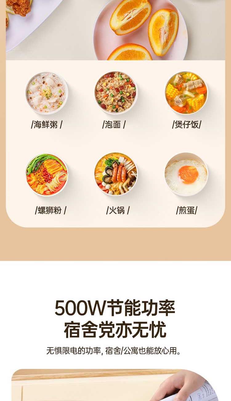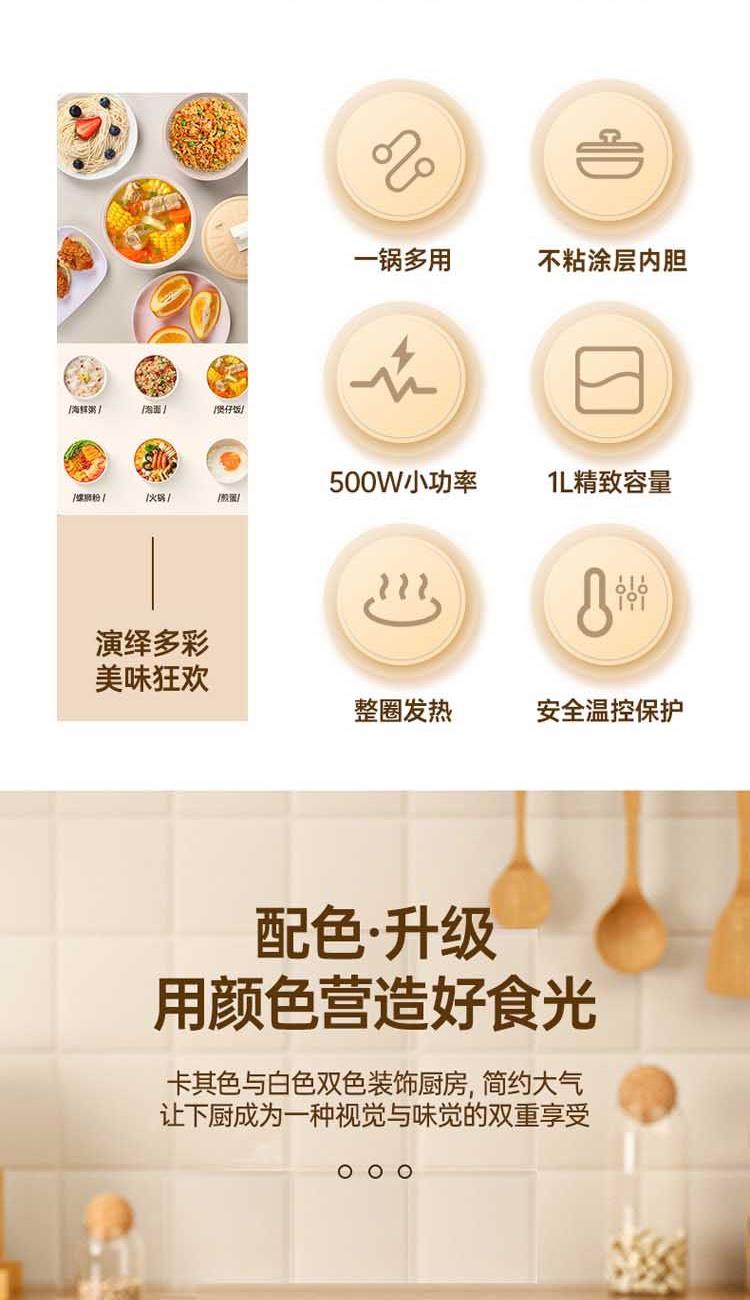 防烫隔热,耐用装满也能轻松提起 不粘内胆,采用陶瓷釉内胆,易清洁 1升加深锅体设计,可满足1人至多人份量 500W速煮功率,涮煮焖炖,美味快速搞定 一机多用,锅盖可变身手机支架