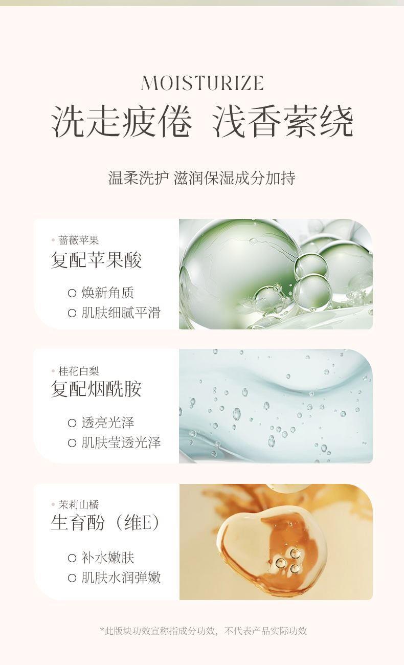 1、元气醒肤,惬享花果香,氤氲清香中浴见元气美肌。 2、专研皂基配方,绵密云朵浴毛孔级净澈。清洁力更强一冲即净,泡沫丰盈绵密柔和亲肤。 3、洗走疲倦浅香萦绕,开启愉悦身心之旅。茉莉山橘香,如置身雨后柑橘园,感受微风夹杂清甜花香。