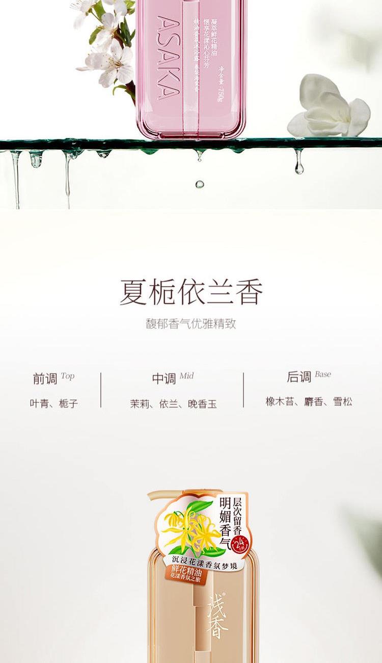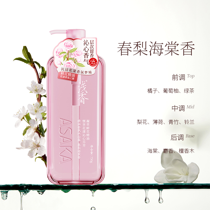 1、精油养肤,浴见花香。鲜花精油SPA24小时持久留香。 2、「面护级」宠肤,鲜花精油 x 氨基酸表活。「依兰花精油」凝练依兰花精萃,天然养肤力。「氨基酸表活」泡沫丰盈绵密,水润不拔干。 3、24小时持久留香,将香气锁进每寸肌肤。春梨海棠香,自带清冷气场。