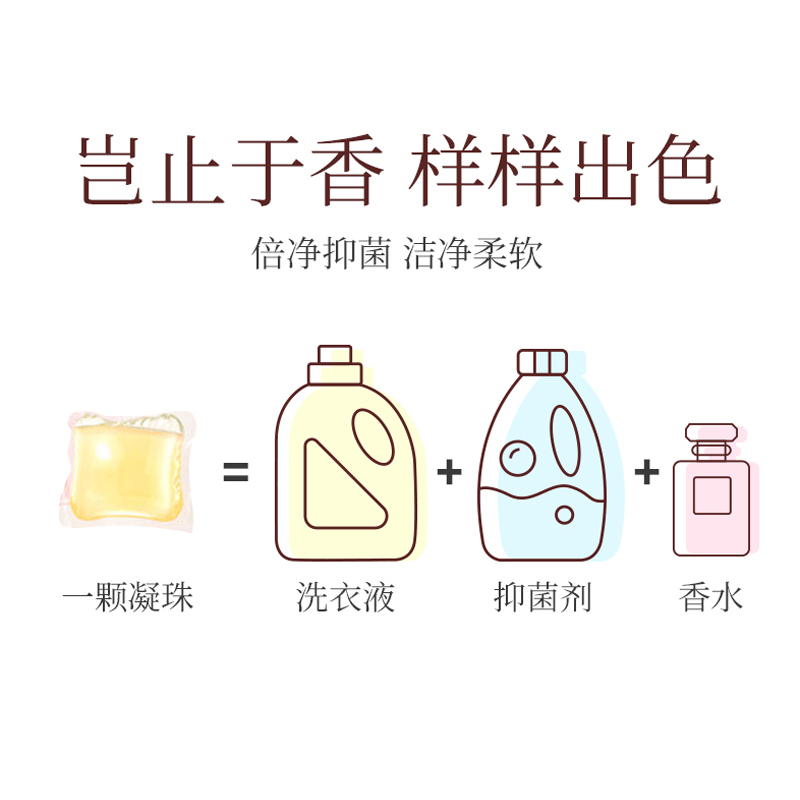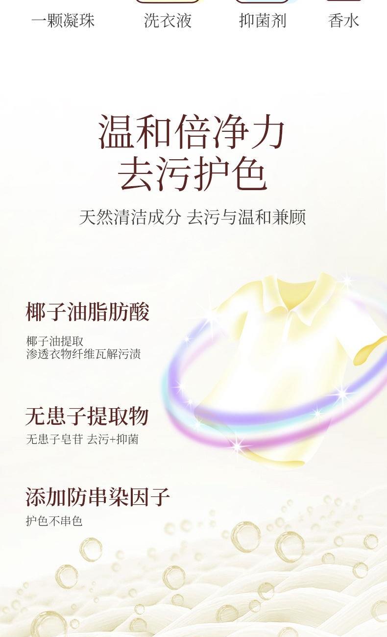 1、温和洁净,护衣护色,柔顺留香。 2、天然洁净因子,快速释放洁净成分,深层瓦解,轻松祛除衣物上多种顽固污渍。