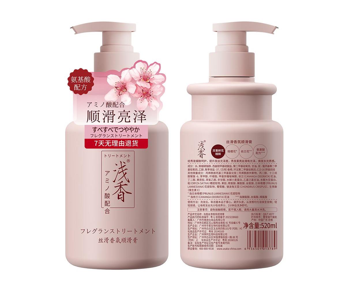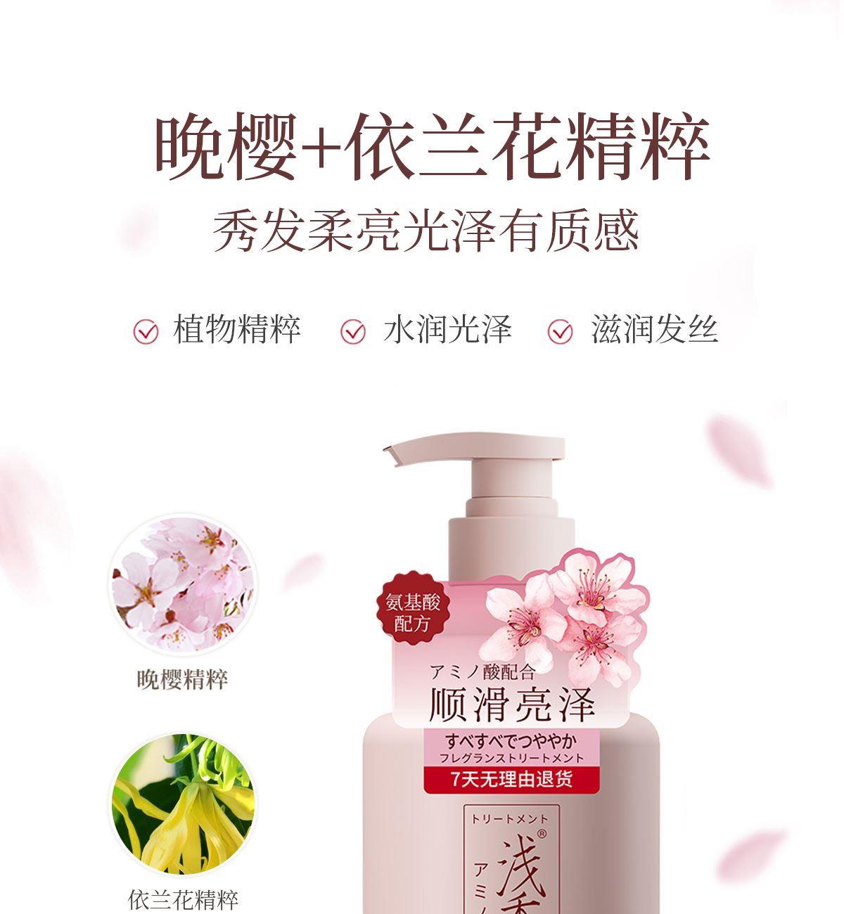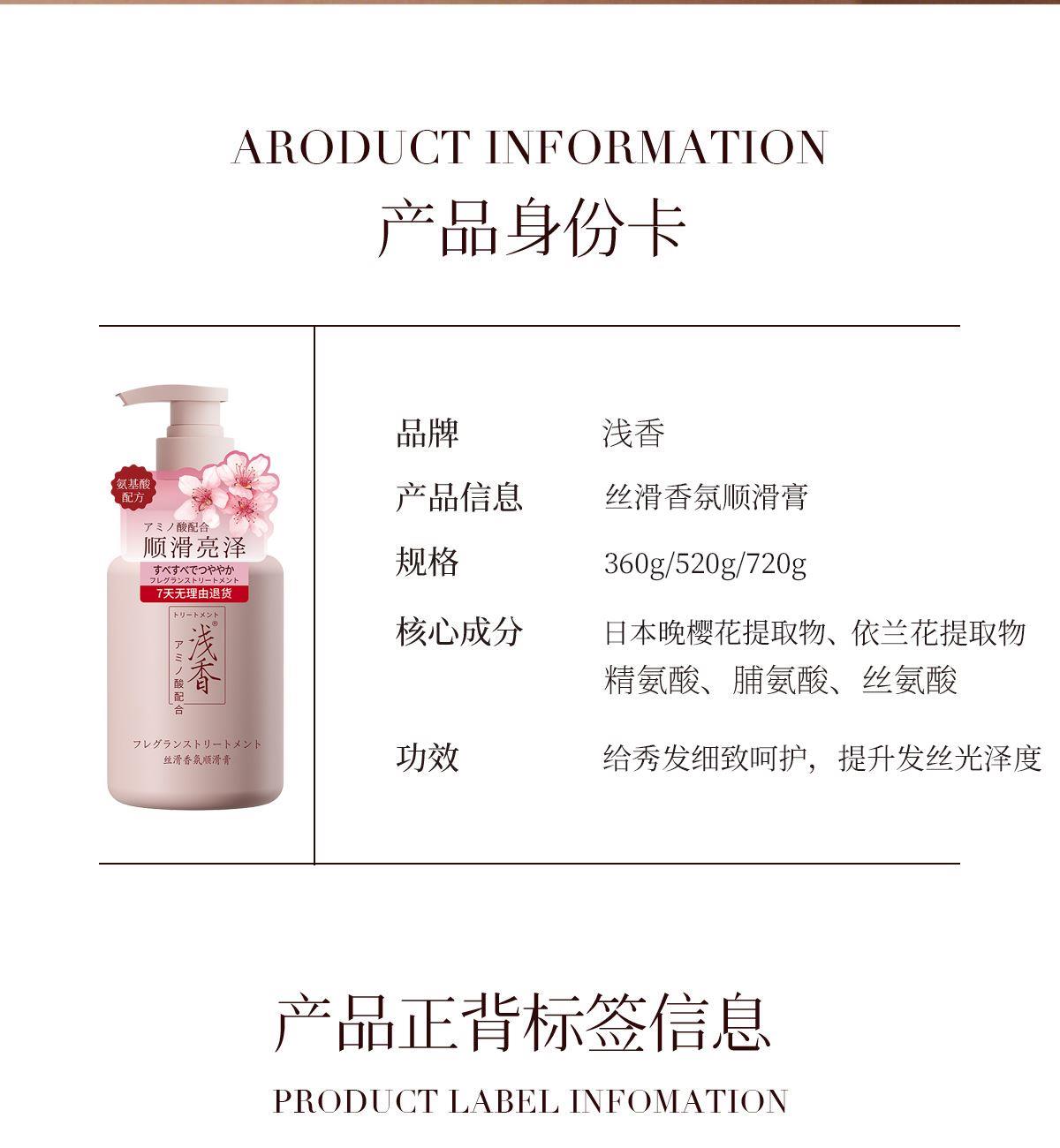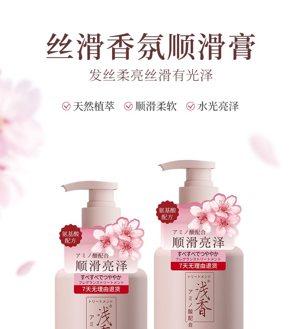 1、双重鲜花精粹:晚樱+依兰花精粹。 三重氨基酸营养成分:丝氨酸、精氨酸、脯氨酸。 2、含有多种维生素,有效滋润秀发,减少水分流失,改善干枯毛躁,赋予秀发光泽感。 3、三种氨基酸都极具保湿能力,有效锁住发丝水分,呵护手鳞片在浅香洗发水中同时作用为营养剂,填补发芯空洞,增强发丝弹性。
