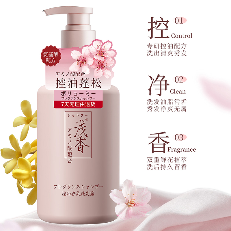 1、温和控油,氨基酸配方体系搭配天然植物精粹;洗去多余油脂;令发根清爽、发丝蓬松,长效保持水油均衡。 2、氨基酸控油配方,有效清洁头皮,促进头皮微生态水油平衡,泡沫细腻丰富,易过水冲洗。 3、樱花含有丰富的天然维生素A、B、E:樱叶酶、樱皮甙具有抑制脱发功效:樱叶黄酮可抗糖化、增强发丝韧。桂花精具有舒缓作用,能够缓解头皮敏感不适症状,并对疮有一定的抑制能力,有效清除自由基,改善头发暗哑粗糙。